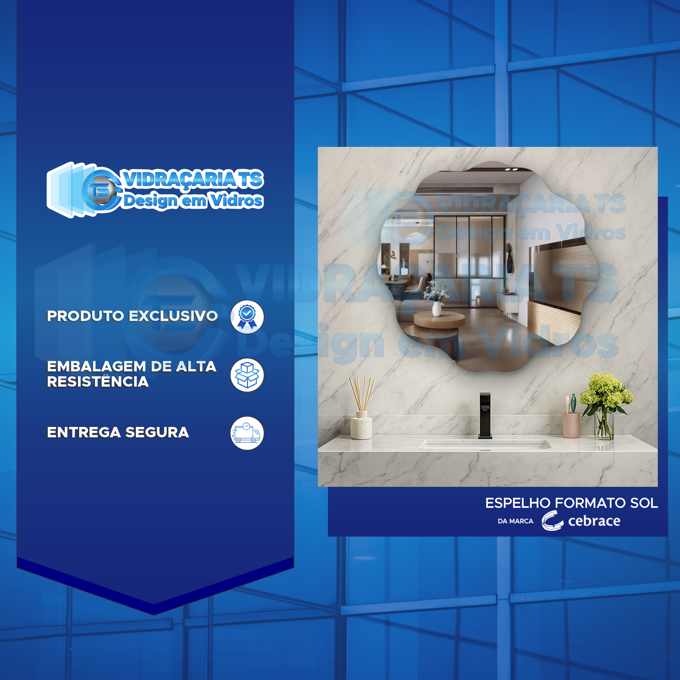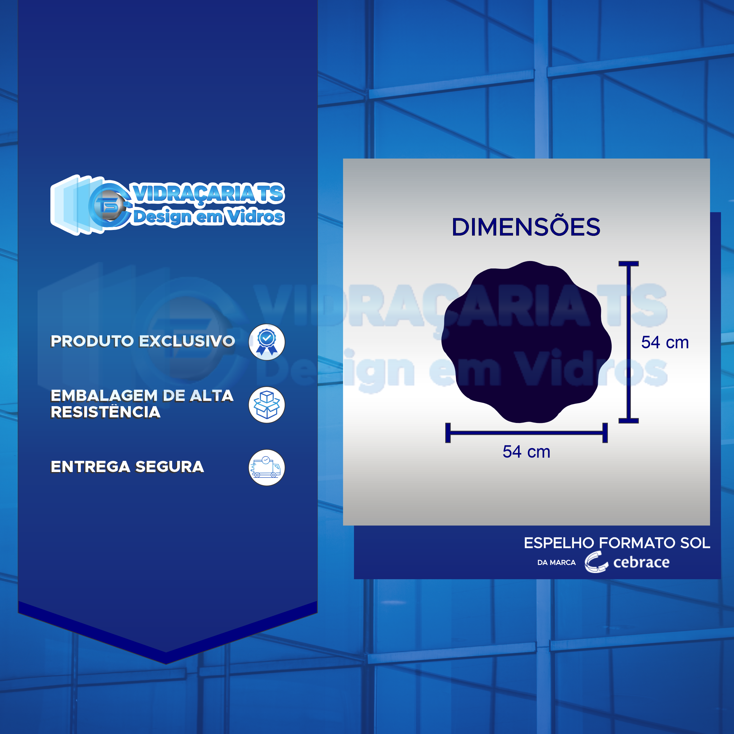 O Espelho Formato Sol de 3mm da Cebrace é uma peça cheia de personalidade. Com 54 cm de diâmetro e apenas 1,43 kg, ele é leve e fácil de instalar. O design redondo remete ao sol, trazendo energia e sofisticação para salas, halls ou até quartos.